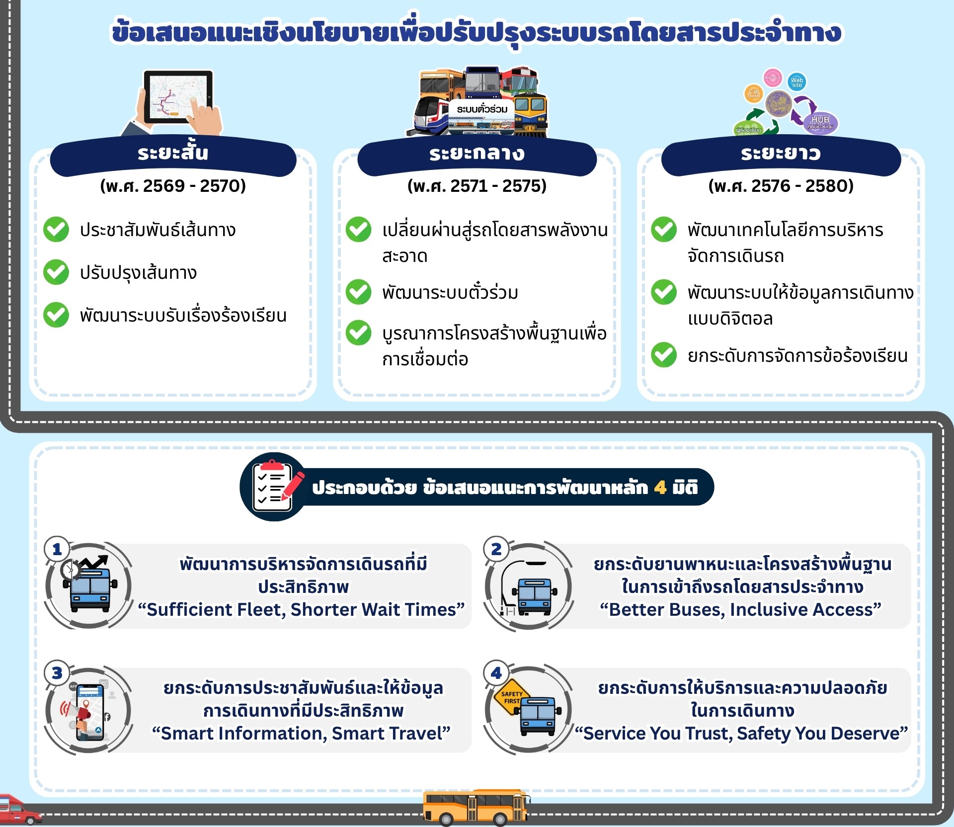 - การจัดทำข้อเสนอแนะเชิงนโยบายในการพัฒนาระบบรถโดยสารประจำทางในกรุงเทพฯปริมณฑล (สำหรับแผนระยะสั้น, ระยะกลาง และระยะยาว)